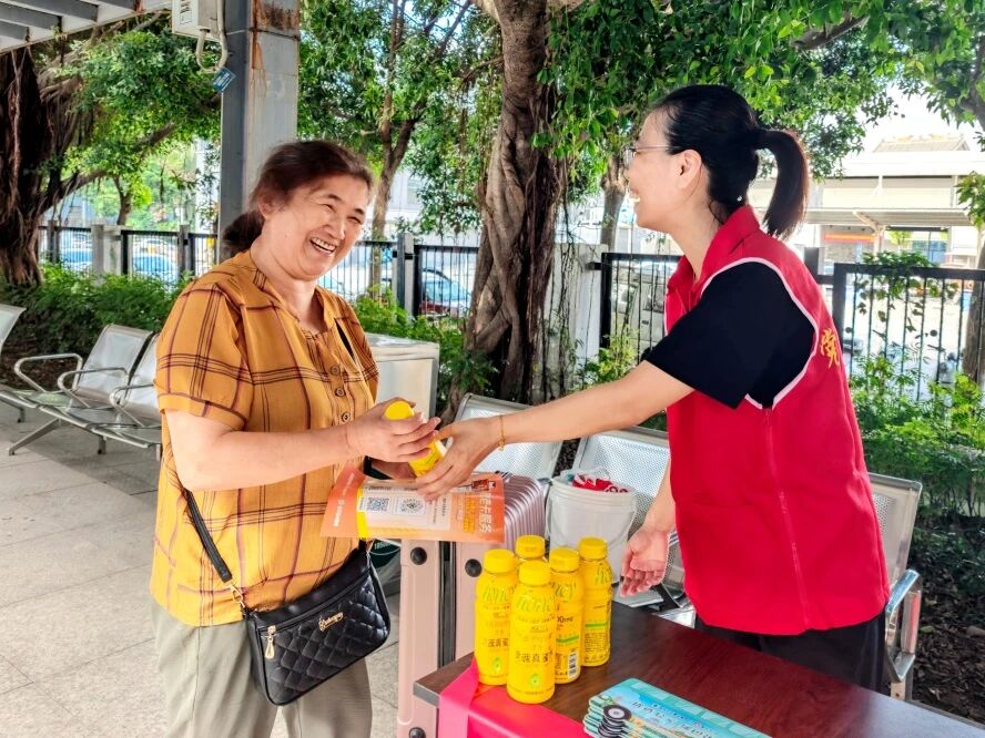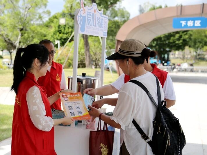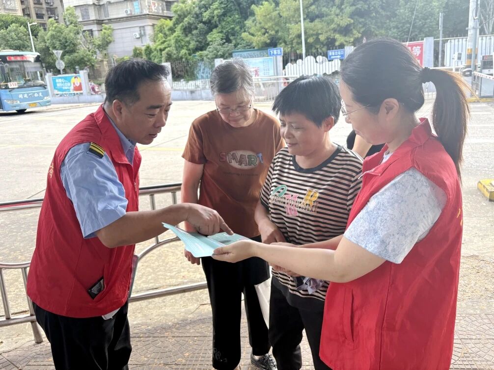 “阿姨,您先喝口水歇歇脚,正好可以了解一下我们的公交地铁换乘码和敬老卡服务。我们刚刚推出了敬老卡线上年审服务,非常方便。”在等待公交车发车的间隙,市民王女士接过公交志愿者递来的茶水和宣传册,她认真阅读起宣传页的内容并不时提问,志愿者许晓红在一旁耐心解答。