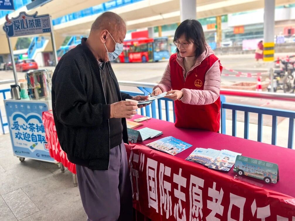 上午9时,在火车站北广场站、火车南站、公交仁德站的“爱心茶摊”周围人潮涌动,志愿者们结合“文明有礼暖榕城”行动要求,默契配合、分工协作,有的向市民群众发放敬老卡服务宣传单和宪法宣传册,有的给市民群众和一线劳动者送上热茶水,还有的分散在候车区内,提供文明劝导、线路问询、出行指引、行李搬运、扶老携幼等便民服务,倡导市民群众优先选择乘坐公共交通出行,践行文明行为,养成文明习惯,共同营造文明出行、绿色出行的良好社会氛围。