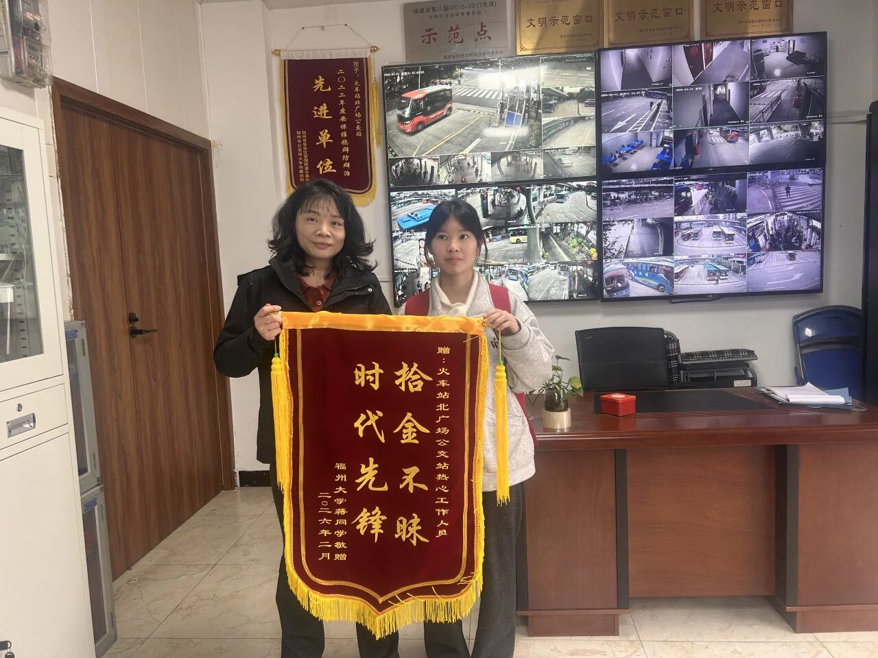 与此同时,各大场站内暖意融融、爱心涌动,公交干部职工用点滴善举擦亮城市文明底色。海峡奥体公交枢纽站站长鄢丽榕、鼓山公交总站站长黄晓潇、福新公交枢纽站站长林春晓、公交鹤林站站长蒋李平等及时救助迷路老人和突发身体不适的乘客;火车站北广场站站长马乐萍巡查时发现候车座椅上遗落一台笔记本电脑,她妥善保管并立即调取视频监控,经多方寻找,电脑完好无损地归还失主蒋同学,蒋同学为此特意送来印有 “拾金不昧 时代先锋”字样的锦旗,台江广场站站长徐榕风、火车站南广场站站长陈宏力也先后拾获手机并物归原主;公交职工王梅芳在省立医院站乘车时,遇到丢失重要证件和物品的市民叶女士,她主动帮忙联系,协助排查车辆,最终于当天傍晚为叶女士找回失物。